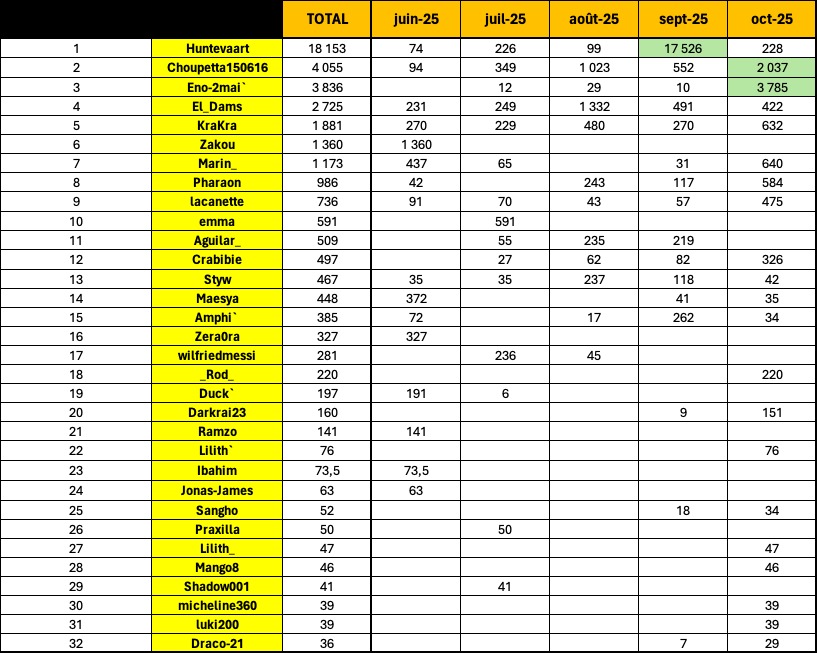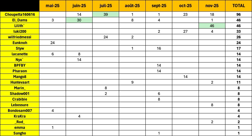 🥇 Lilith` : 46 pts (Novembre 2025)