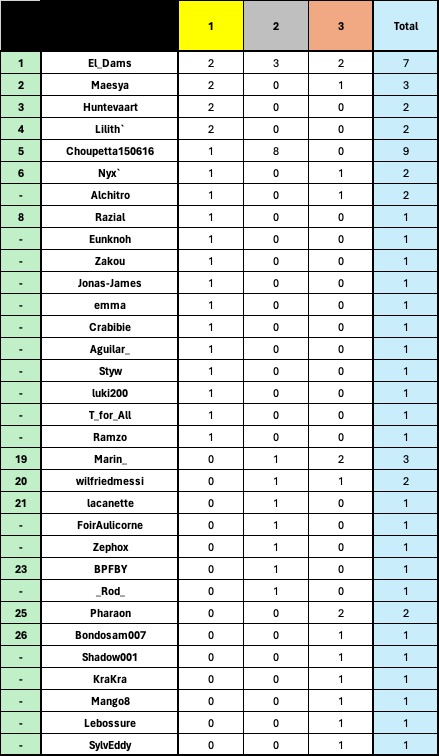 14. Jonas-James : 63 pts 15. pharaonanocris : 42 pts 16. Styw : 35 pts
