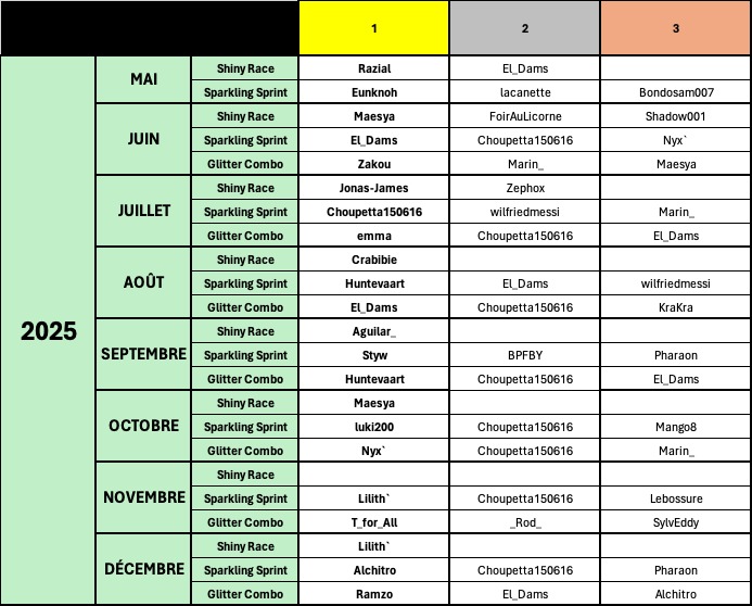 Merci à tous d’avoir participé au Glitter Combo (16 joueurs ont enregistré leurs scores) et félicitations à Zakou, qui grâce à un seul œuf de Bulbizarre Pixel remporte haut la main cette première édition du Combo. Marin_ et Saneiko arrivent un peu plus loing avec respectivement 1477 et 1256 points, grâce eux aussi, à des œufs d’Hatolo Pixel et de Carapuce Amé.