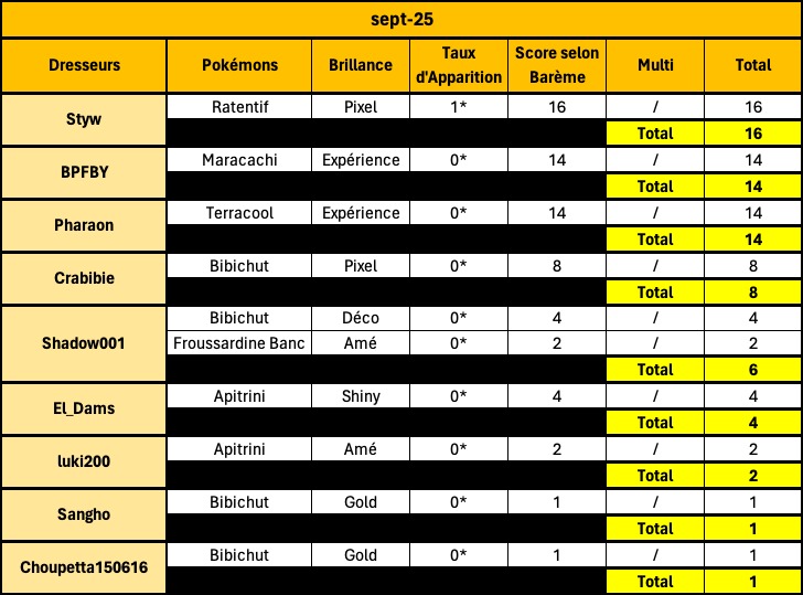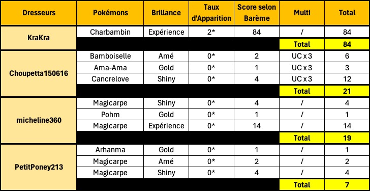 Choupetta150616 et Nyx`Mixxty complètent le podium et ne sont départagés que parce que Choup a attrapé son Nenupiot Expérience 8 minutes plus tôt que Nyx son Granivol Expérience.