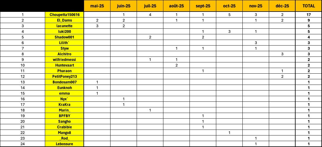 4. DANSLESCANETTES : 8 pts - 5. KraKra : 4 pts