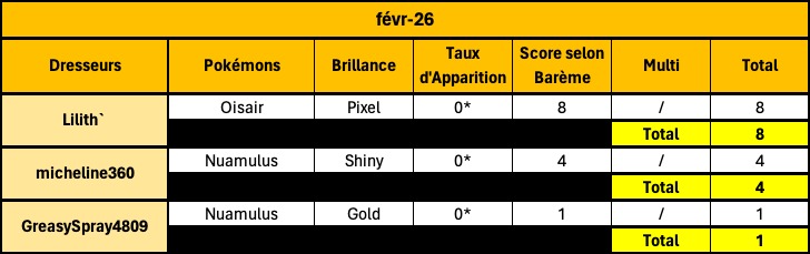 Félicitations à Lilith` qui remporte cette édition du Sprint, grâce à un Oisair pixel, devant micheline360 et GreasySpray4809 avec leur Nuamulus Shiny & Gold.