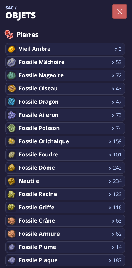 Vos fossiles sont dans la section "Pierres" de votre sac.
